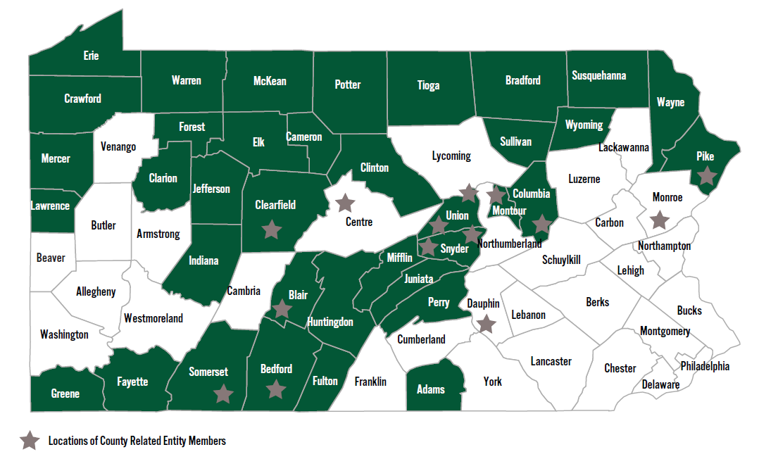 PComp can provide workers' compensation coverage for counties, and for county-related entities such as nursing homes and county joinders. County-related entities, for the purposes of membership in PComp, are organizations created and controlled by one or more counties to perform typical county functions.